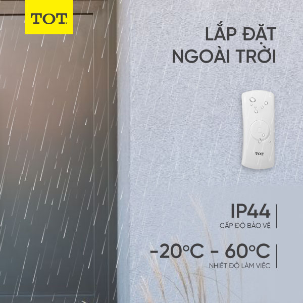 Nút nhấn của chuông cửa TOT đạt cấp độ bảo vệ IP44, giúp thiết bị hoạt động ổn định ngay cả khi lắp đặt ngoài trời trong điều kiện mưa gió. Bên cạnh đó, dải nhiệt độ làm việc cực rộng từ -20°C đến 60°C đảm bảo chuông vẫn hoạt động chính xác dù trong mùa đông giá rét hay mùa hè nắng gắt.